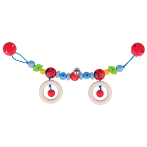 Un allegro gioco da passeggino, decorato con simpatiche coccinelle e perline colorate in legno.