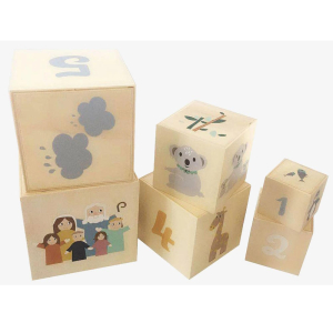 Sei cubi in legno di dimensioni diverse con tanti colori ed immagini a tema Arca di Noè. I cubi si possono impilare o uno sopra l'altro, o uno dentro l'altro o orizzontalmente sul pavimento. Inoltre presentano i numeri da 1 a 6 per iniziare a contare.